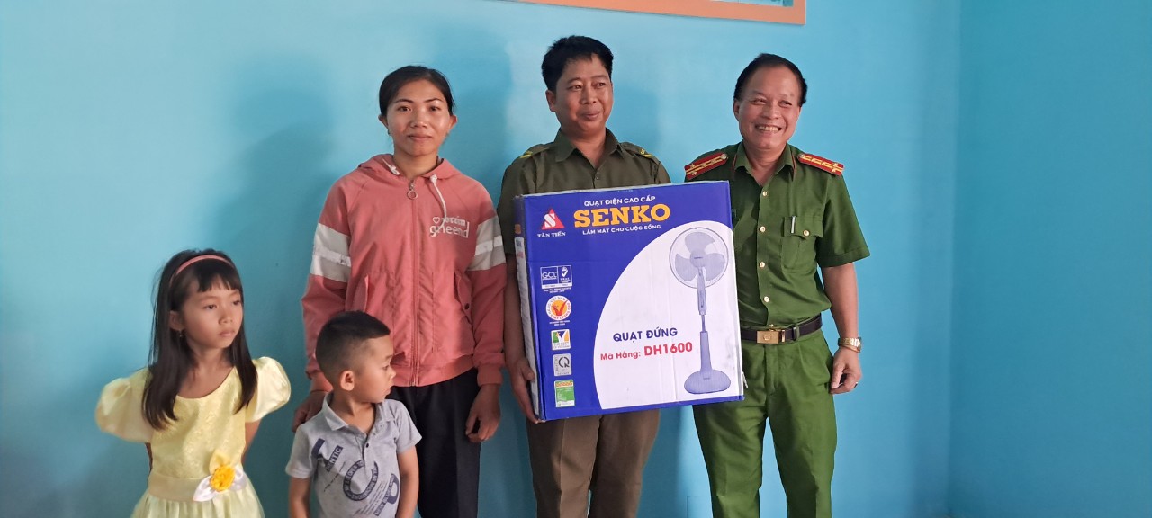Đại tá Phan Thanh Tám, Giám đốc Công tỉnh cùng nhà hảo tâm, lãnh đạo UBND huyện và Công an huyện Sông hinh trao thêm quà cho gia đình đồng chí Nay Y Nhe trong buổi lễ trao nhà tình nghĩa.