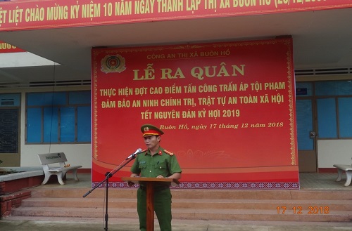 Thực hiện kế hoạch của Công an tỉnh về tổ chức đợt cao điểm tấn công trấn áp tội phạm, đảm bảo an ninh chính trị, trật tự an toàn xã hội Tết Nguyên đán Kỷ Hợi 2019, sáng ngày 17/12/2018, Công an thị xã Buôn Hồ đã tổ chức Lễ ra quân tấn công trấn áp tội phạm với sự tham dự của thường trực Thị ủy, HĐND, UBND thị xã, Ban Chỉ đạo PCTP, TNXH và XDPTBVANTQ thị xã; Ban chỉ đạo PCTP, TNXH và XDPTBVANTQ các xã phường và 100% cán bộ chiến sĩ thuộc Công an thị xã.