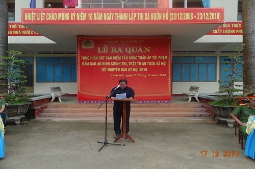 Tại Lễ ra quân, đồng chí Trung tá Trần Quang Vinh – Phó trưởng Công an thị xã Buôn Hồ phát biểu đánh giá tình hình từ nay đến Tết Nguyên đán Kỷ Hợi 2019, trên địa bàn thị xã Buôn Hồ diễn ra nhiều hoạt động chính trị, kinh tế, văn hóa, xã hội quan trọng, như: Kỷ niệm 10 năm Ngày thành lập Thị xã Buôn Hồ, Lễ Noel 2018, Tết Dương lịch 2019... Theo quy luật đây cũng là thời điểm mà tình hình an ninh, trật tự có nhiều diễn biến phức tạp; các đối tượng chính trị, phản động gia tăng các hoạt động chống phá; hoạt động của các loại tội phạm gia tăng cả về số lượng, tính chất, mức độ; tai nạn, va chạm giao thông có nhiều diễn biến khó lường. Vì vậy, để đảm bảo tình hình an ninh, trật tự, an toàn giao thông trong thời gian sắp tới là nhiệm vụ hết sức cấp bách và cần thiết đòi hỏi sự tham gia của các ban ngành, đoàn thể của địa phương, trong đó lực lượng Công an là nòng cốt.