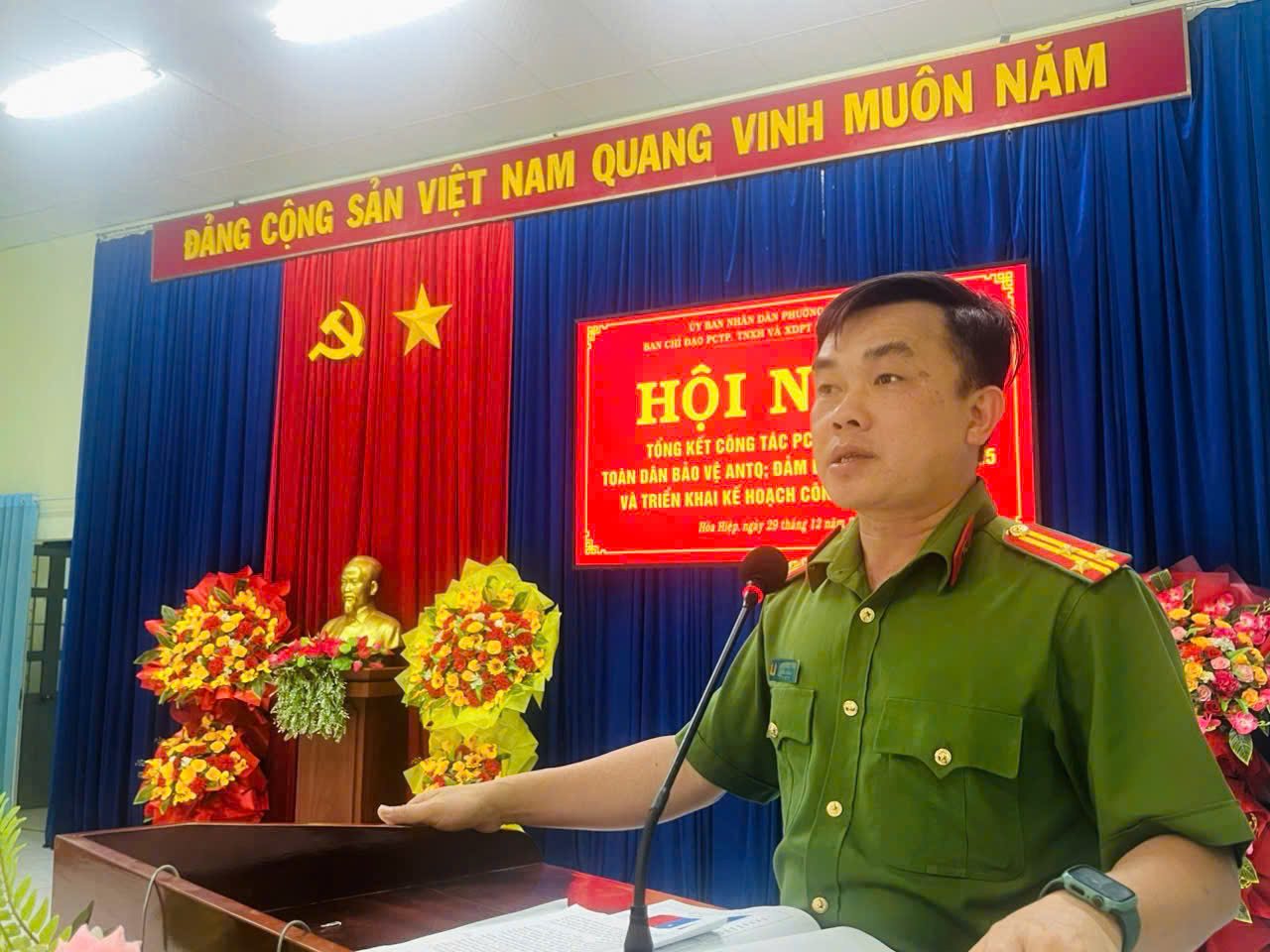 Tại hội nghị, các đại biểu đã được nghe báo cáo tình hình, kết quả công tác phòng, chống tội phạm, tệ nạn xã hội; công tác xây dựng phong trào toàn dân bảo vệ an ninh Tổ quốc và công tác bảo đảm trật tự, an toàn giao thông trên địa bàn phường trong năm 2025. Báo cáo nêu rõ, trong năm qua, với sự quan tâm lãnh đạo, chỉ đạo sát sao của Đảng ủy, UBND phường, sự phối hợp chặt chẽ của các ban, ngành, đoàn thể và sự đồng thuận, ủng hộ của Nhân dân, tình hình an ninh chính trị, trật tự an toàn xã hội trên địa bàn phường Hòa Hiệp cơ bản được giữ vững, các loại tội phạm và tệ nạn xã hội được kiềm chế, không để phát sinh điểm nóng, phức tạp kéo dài.