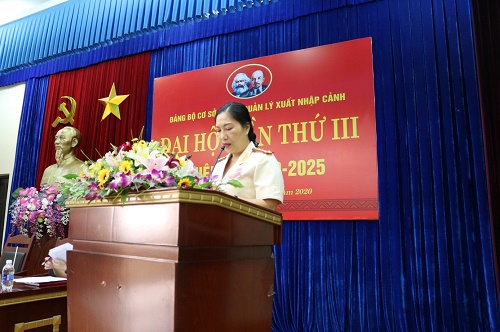 Đồng chí Đại tá Nghiêm Thanh Thủy - Bí thư Đảng ủy, Trưởng phòng Quản lý xuất nhập cảnh phát biểu tại Đại hội