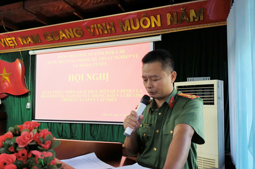 Vừa qua, Đảng ủy cơ sở Phòng Kỹ thuật nghiệp vụ và Ngoại tuyến Công an tỉnh Đắk Lắk đã tổ chức Hội nghị quán triệt, triển khai thực hiện quy định của Bộ chính trị, nghị quyết, thông báo và chương trình của cấp ủy cấp trên đến toàn thể đảng viên trong đơn vị.