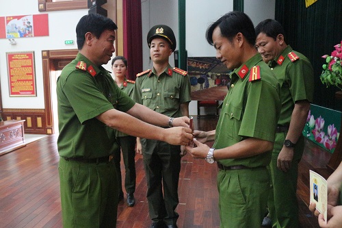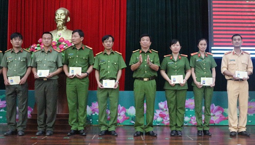 Đ/c Đại tá Nguyễn Văn Hội - Phó Giám đốc Công an tỉnh trao Giấy chứng nhận cho học viên hoàn thành khóa bồi dưỡng