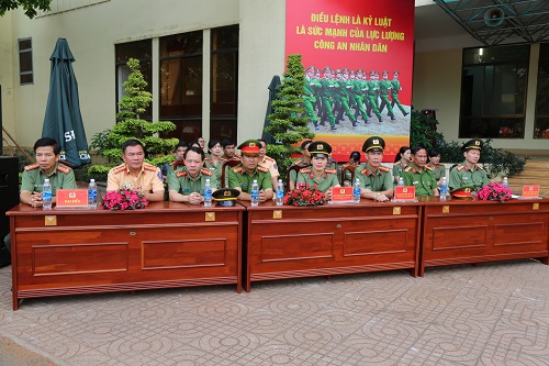 Lãnh đạo Công an tỉnh và Ban Tổ chức theo dõi các đơn vị công diễn