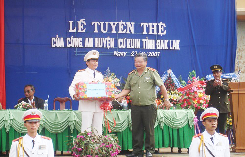 Đ/c Thượng tướng Nguyễn Khánh Toàn - Nguyên Thứ trưởng Bộ Công an tham dự và tặng quà CBCS Công an huyện Cư Kuin tại Lễ Tuyên thệ thành lập Công an huyện Cư Kuin