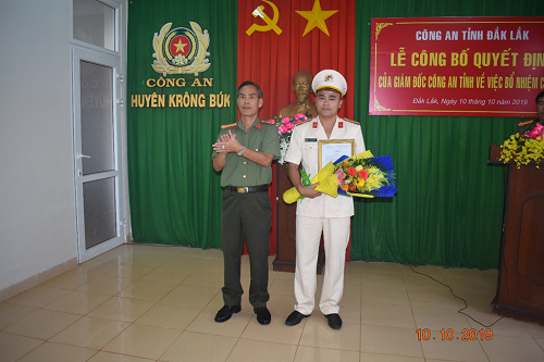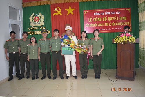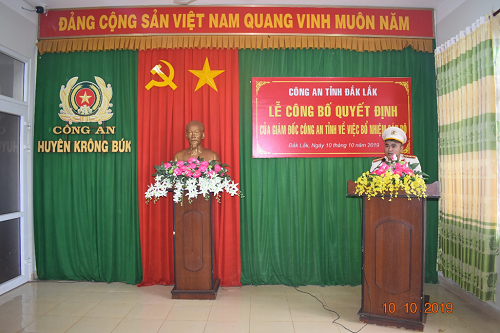 Ngày 10/10/2019, tại Hội trường Công an huyện Krông Búk, Đại tá Nguyễn Thế lực, Ủy viên Ban Thường vụ Đảng ủy, Phó Giám đốc Công an tỉnh chủ trì Lễ công bố quyết định của Giám đốc Công an tỉnh về công tác cán bộ. Tham dự buổi Lễ có các đồng chí là lãnh đạo UBND huyện, Viện kiểm sát nhân dân huyện cùng toàn thể lãnh đạo, cán bộ chiến sĩ Công an huyện.