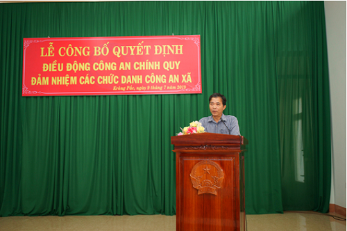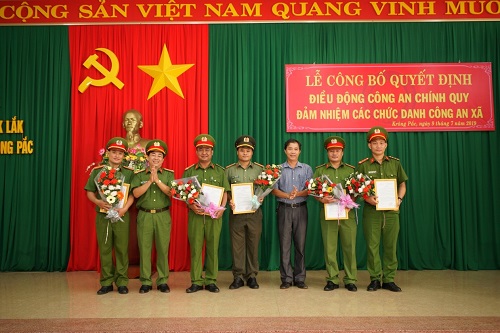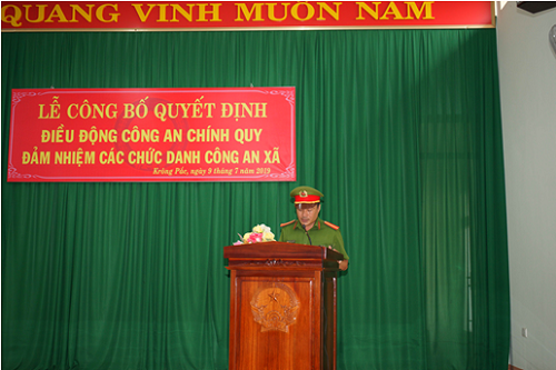 Tại buổi Lễ, lãnh đạo Công an huyện đã công bố quyết định của Giám đốc Công an tỉnh về việc điều động 17 đồng chí Công an chính quy đảm nhiệm các chức danh Công an xã trên địa bàn 04 xã thuộc huyện Krông Pắc (Ea Knuêc, Ea Kênh, Ea Yiêng và Krông Búk). Đây là những cán bộ Công an tiêu biểu được Đảng ủy, lãnh đạo Công an huyện lựa chọn đưa về cơ sở để gần dân, sát dân, nắm chắc tình hình địa bàn, nhằm giải quyết các vấn đề liên quan an ninh, trật tự khi mới phát sinh ngay từ cơ sở. Tính đến thời điểm hiện tại, Công an huyện Krông Pắc đã điều động 25 đồng chí Công an chính quy (06 Trưởng Công an xã, 07 Phó Công an xã và 12 Công an viên) đảm nhiệm chức danh Trưởng, Phó trưởng Công an xã, Công an viên về 06/14 xã của huyện.