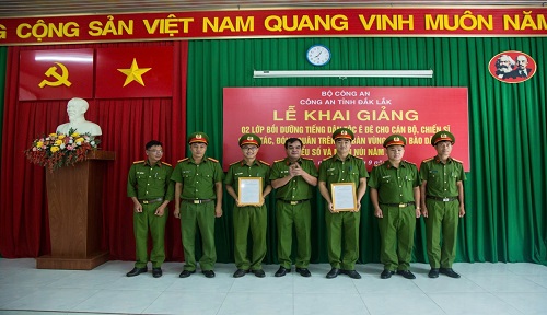 Sáng ngày 16/9/2024, Công an tỉnh Đắk Lắk phối hợp Trung tâm Giáo dục nghề nghiệp – Giáo dục thường xuyên thành phố Buôn Ma Thuột tổ chức Lễ khai giảng 02 lớp bồi dưỡng tiếng dân tộc Ê Đê cho 80 học viên là cán bộ, chiến sĩ công tác, đóng quân trên địa bàn vùng đồng bào dân tộc thiểu số và miền núi. Tham dự buổi Lễ, về phía Công an tỉnh có đồng chí Đại tá Y San ADrơng, Ủy viên Ban Thường vụ Đảng ủy - Phó Giám đốc Công an tỉnh và đại diện lãnh đạo một số Phòng nghiệp vụ thuộc Công an tỉnh. Về phía Trung tâm Giáo dục nghề nghiệp – Giáo dục thường xuyên thành phố Buôn Ma Thuột có đồng chí Hà Ngọc Anh – Giám đốc Trung tâm và các đồng chí giáo viên thuộc Trung tâm tham gia giảng dạy 02 lớp bồi dưỡng.