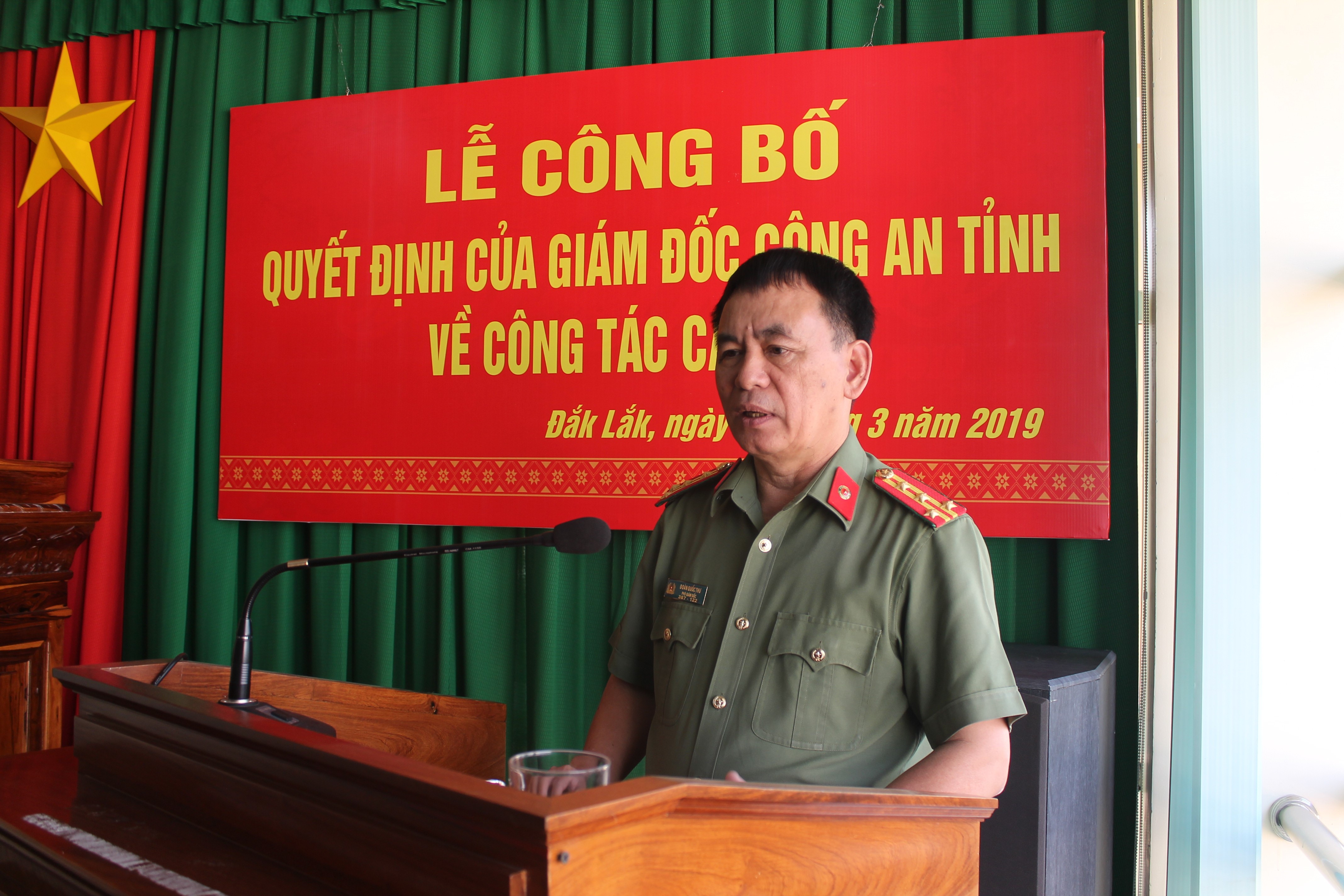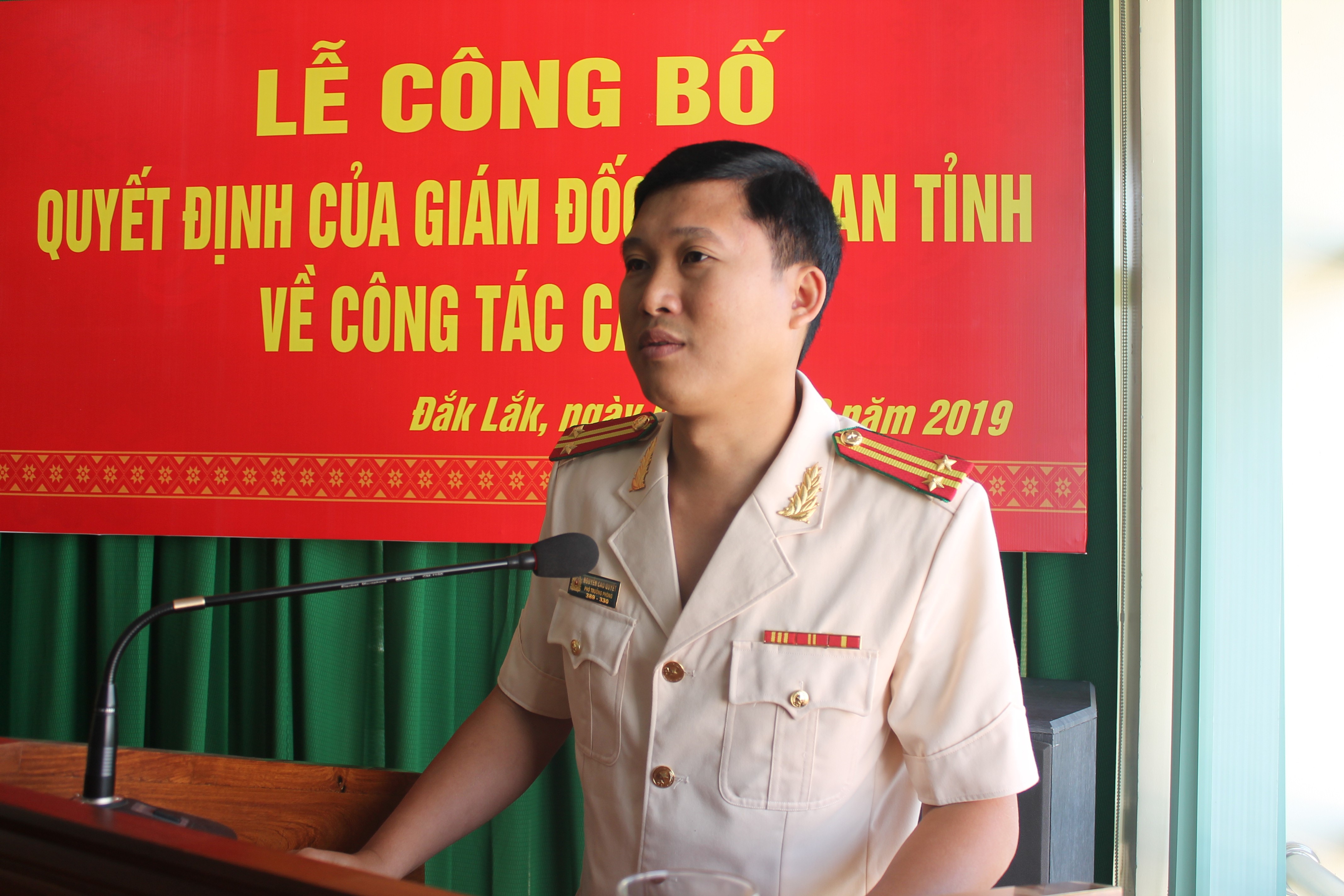 Căn cứ yêu cầu công tác, trên cơ sở xem xét phẩm chất, năng lực, trình độ cán bộ, ngày 07/3/2019, Công an tỉnh Đắk Lắk đã tổ chức Lễ công bố và trao Quyết định của Giám đốc Công an tỉnh về việc điều động đồng chí Trung tá Nguyễn Cao Quyết - Phó Trưởng phòng Tham mưu đến nhận công tác và giữ chức vụ Phó Trưởng phòng Hậu cần. Đồng chí Đại tá Đoàn Quốc Thư - Phó Bí thư Đảng ủy, Phó Giám đốc Công an tỉnh chủ trì buổi lễ.