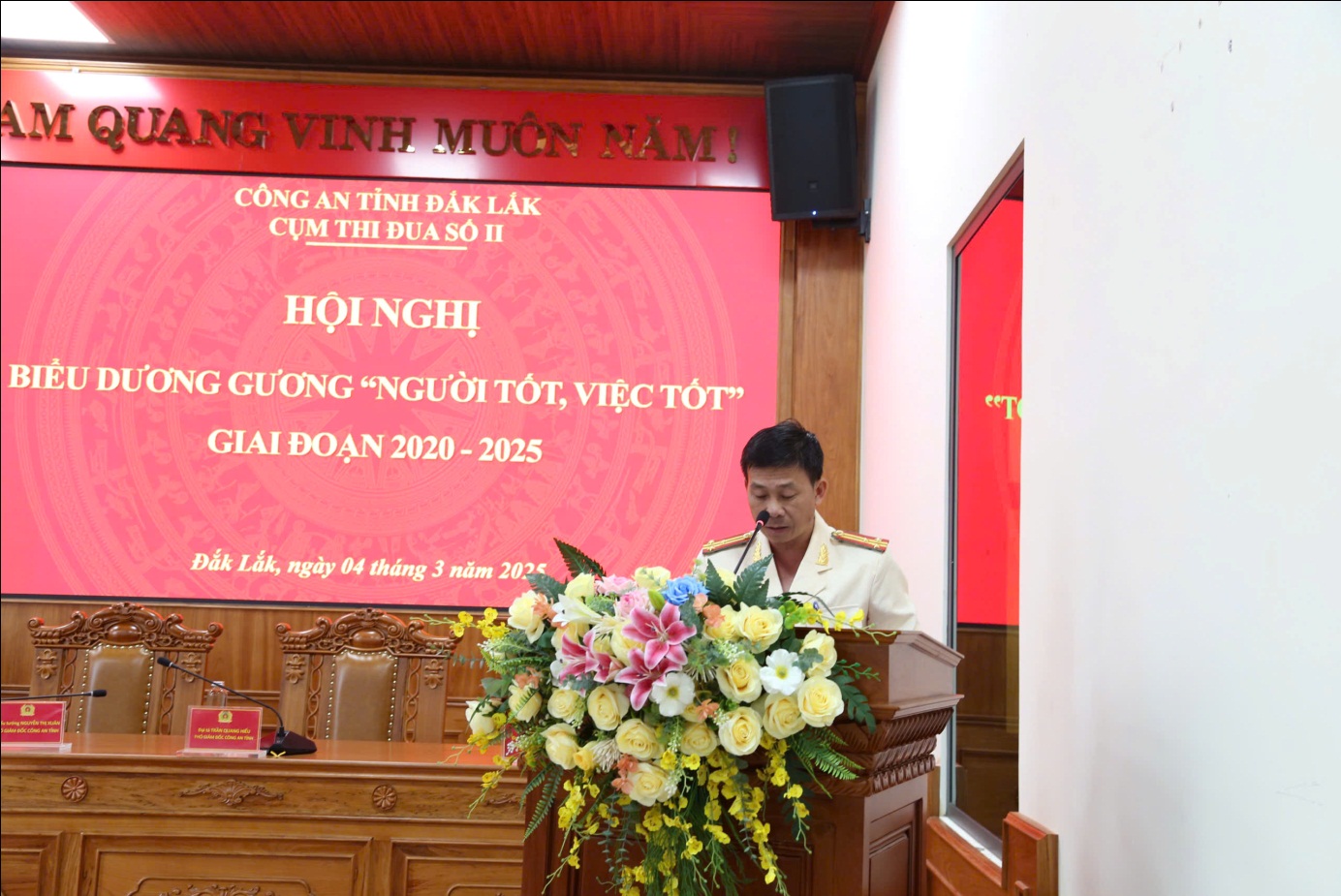 Nhằm biểu dương, tôn vinh các tập thể, cá nhân có thành tích tiêu biểu, xuất sắc trong công tác, chiến đấu để nhân rộng các điển hình tiên tiến, gương người tốt, việc tốt. Ngày 04/3/2025, Cụm thi đua số II Công an tỉnh Đắk Lắk đã tổ chức Hội nghị biểu dương gương “Người tốt, việc tốt” giai đoạn 2020 - 2025.