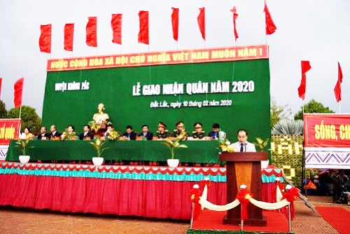 Hòa chung không khí sôi nổi ngày hội tòng quân trên toàn tỉnh, sáng ngày 10/02/2020, tại Quảng trường trung tâm huyện Krông Pắc, UBND huyện long trọng tổ chức lễ giao, nhận quân năm 2020. Đến dự buổi lễ có đồng chí Nguyễn Công Bảo - Chủ tịch Liên đoàn lao động tỉnh; đ/c Trần Hồng Tiến - Tỉnh ủy viên, Bí thư Huyện ủy; Đ/c Đinh Xuân Diệu - Phó Bí thư Huyện ủy, Chủ tịch UBND huyện; đ/c Mai Đình Thọ - Phó Bí thư Huyện ủy; đại diện lãnh đạo các ban, ngành, đoàn thể của huyện và lãnh đạo Đảng ủy, UBND 16 xã, thị trấn; đại diện đơn vị nhận quân cùng đông đủ các tân binh và người thân đến tiễn và động viên thanh niên lên đường nhập ngũ bảo vệ Tổ quốc.