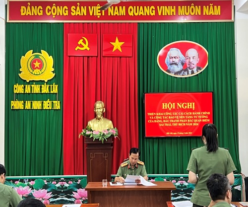 Vừa qua, tập thể lãnh đạo và cán bộ chiến sĩ Phòng An ninh điều tra Công an tỉnh tổ chức Hội nghị triển khai công tác cải cách hành chính và công tác bảo vệ nền tảng tư tưởng của Đảng, đấu tranh phản bác các quan điểm sai trái, thù địch nhằm đánh giá kết quả triển khai các mặt công tác trên thời gian qua, đồng thời đề ra những sáng kiến, giải pháp nâng cao chất lượng, hiệu quả đối với hai công tác này trong thời gian tới.