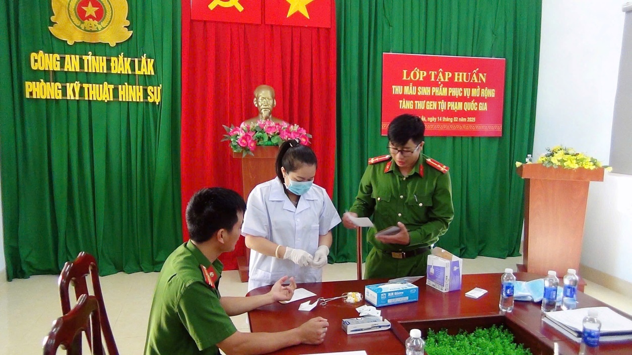 Ngày 14/02/2025, Phòng Kỹ thuật hình sự Công an tỉnh Đắk Lắk tổ chức lớp tập huấn thu mẫu sinh phẩm mở rộng Tàng thư gen tội phạm quốc gia cho cán bộ chiến sĩ của đơn vị và cán bộ thuộc Trại giam Đắk Tân và Trại giam Đắk Trung theo Kế hoạch của Bộ Công an về mở rộng Tàng thư gen tội phạm quốc gia nhằm nâng cấp quy mô của tàng thư tội phạm Quốc gia, đáp ứng kịp thời các hoạt động nghiệp vụ, tố tụng và các yêu cầu khác nhằm góp phần bảo vệ an ninh quốc gia, đảm bảo trật tự, an toàn xã hội.