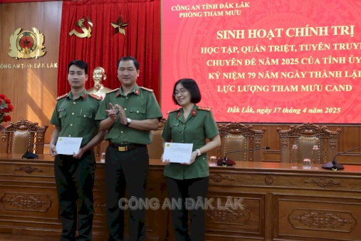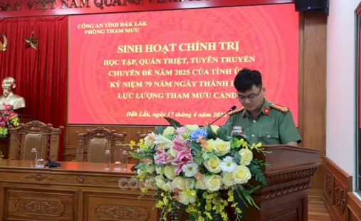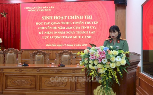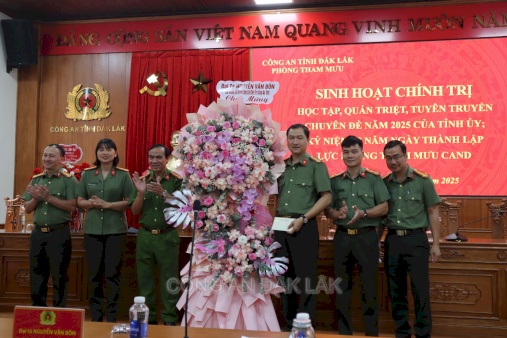 Chiều ngày 17/4/2025, Phòng Tham mưu đã tổ chức buổi sinh hoạt chính trị với chủ đề: “Công an nhân dân rèn đạo đức, luyện tác phong, trọng danh dự; đoàn kết, đổi mới, nêu gương, kỷ cương, trách nhiệm vì nước quên thân, vì dân phục vụ” lồng ghép nghiên cứu, học tập, quán triệt, tuyên truyền về Chuyên đề năm 2025 của Tỉnh ủy. Đồng chí Đại tá Nguyễn Văn Bôn - Phó Bí thư Đảng ủy, Phó Giám đốc Công an tỉnh đã đến dự và tặng hoa chúc mừng đơn vị. Tại buổi sinh hoạt chính trị, cán bộ, chiến sĩ Phòng Tham mưu đã được nghe báo cáo tóm tắt một số nội dung cơ bản của Chuyên đề năm 2025 “Học lập và làm theo tư tưởng, đạo đức, phong cách Hồ Chí Minh về thực hiện tiến bộ, công bằng xã hội; quan tâm chăm lo đời sống vật chất, tinh thần cho đồng bào các dân tộc tỉnh Đắk Lắk”; đề cương tuyên truyền Cuốn sách “Tuyệt đối trung thành với Tổ quốc, với Đảng, Nhà nước và Nhân dân - Sáng ngời tư cách người Công an cách mạng” của Tổng bí thư Tô Lâm; cùng nhau ôn lại truyền thống 79 năm Ngày truyền thống lực lượng Tham mưu. Qua đó, khơi dậy lòng tự hào của cán bộ, chiến sĩ, niềm vinh dự khi đứng trong hàng ngũ lực lượng Tham mưu, góp phần tạo chuyển biến mạnh mẽ, sâu sắc về tư tưởng và hành động của cán bộ, chiến sĩ; tạo động lực cho cán bộ, chiến sĩ tiếp tục nỗ lực phấn đấu rèn luyện, xứng đáng với truyền thống vẻ vang của lực lượng Tham mưu Công an nhân dân. Cũng trong buổi sinh hoạt chính trị, đơn vị đã tổ chức trao giải tuần 2 Cuộc thi tìm hiểu kiến thức trực tuyến trên mạng bội bộ chào mừng 94 năm Ngày thành lập Đoàn Thanh niên Cộng sản Hồ Chí Minh và 79 năm Ngày truyền thống lực lượng Tham mưu Công an nhân dân.