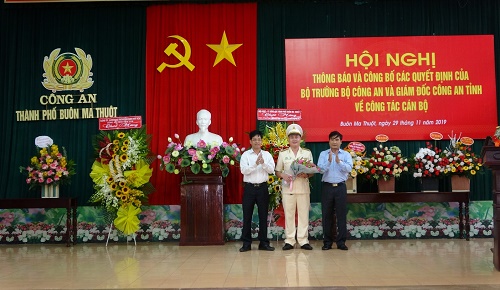 Tập thể lãnh đạo Công an TP. Buôn Ma Thuột tặng hoa chúc mừng đồng chí Trung tá Nguyễn Trần Tuấn.