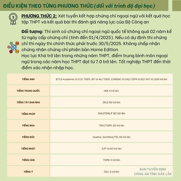 Lưu ý: Chứng chỉ ngoại ngữ được cấp bởi các đơn vị, tổ chức được Bộ Giáo dục và Đào tào cho phép, không sử dụng chứng chỉ Home Edition; chứng chỉ ngoại ngữ quốc tế có thời hạn không quá 02 (hai) năm tính đến ngày 01/4/2025 kể từ ngày được cấp chứng chỉ. Thí sinh có dự định thi chứng chỉ ngoại ngữ quốc tế trong thời gian sơ tuyển thì vẫn cho đăng ký nhưng phải hoàn thành và nộp kết quả về Công an tỉnh trước thời điểm nộp hồ sơ về các trường CAND.